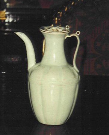 Ying Ching glazed ewer with flowery finial cover , lobed body and ribbed handle. Slightly raised leaf design @ bottom of handle and spout . Two matching loops [on handle & cover ] 8 ½'' H. Late SONG D. [12-13 cent. ]