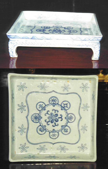 Blue & white tray with four inward turning feet . Interior & exterior fully decorated with florets and inscription. 9 1/8'' W. Four character Mark & Period of Daoguang @ bottom [1821-1850 ] .