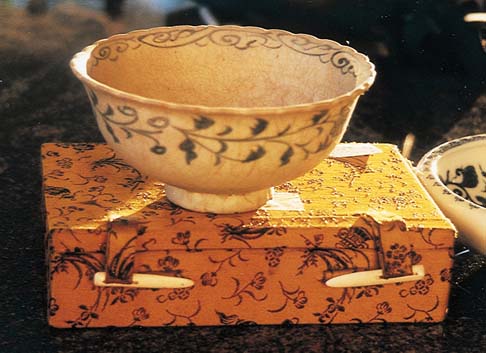 blue and white bowl with floral design, moulded slip inlay in the interior.