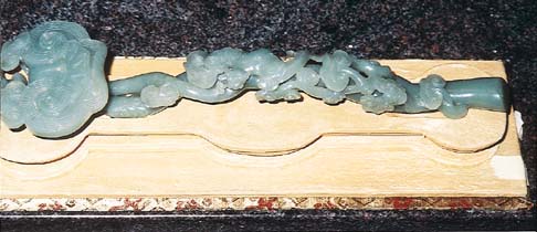 Very fine carved Chinese Celadon Jade Naturalistic form Ruyi Scepter, with elaborate reishi and bat designs (silk stand); 13 1/2" (34.29 CM.) Long;