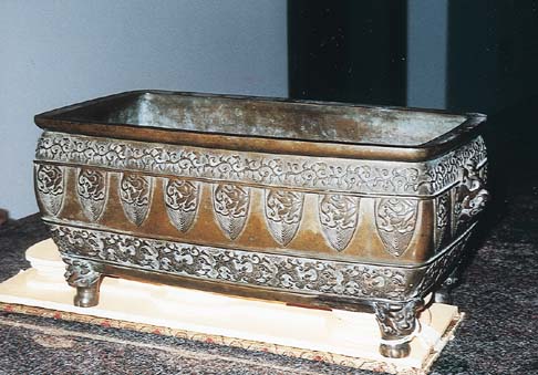 Bronze rectangular jardiniere, with stylized archaistic 12 3/4" long (32.4 CM.), lappets and bands of scrolling foliage, masks at the sides and mask-topped legs. Seal at bottom.