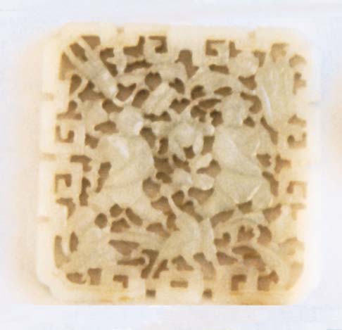 Fully reticulated square plaque celadon jade.