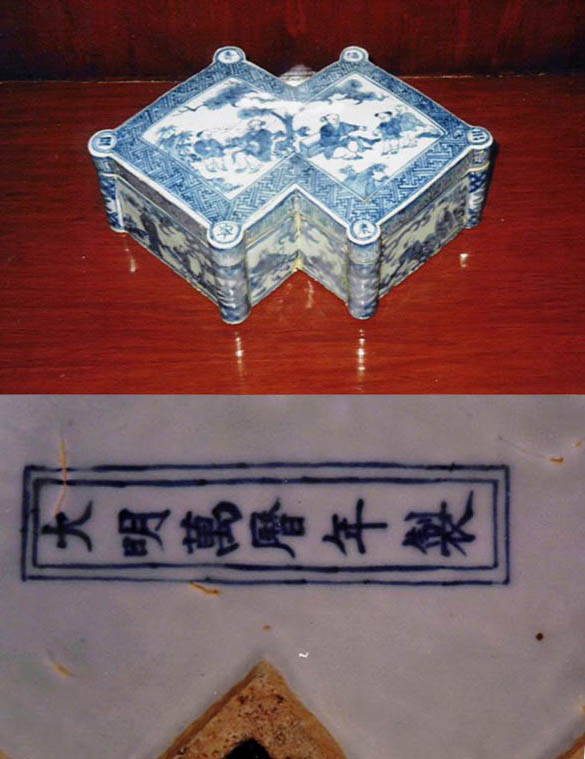 Octagonal blue & white pottery box & cover 12" inches Long, with a vertical six character WANLI [ming] mark [1573-1619 ] Depicts scholars and their teachers all over.