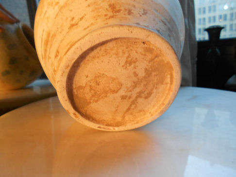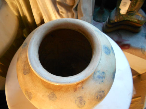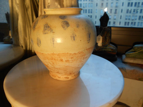 Extremely rare TANG dynasty baluster pottery jar, straw-glazed with blue splash dots 8 1/4" high