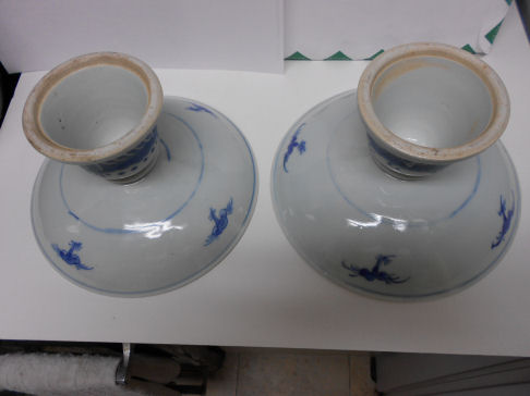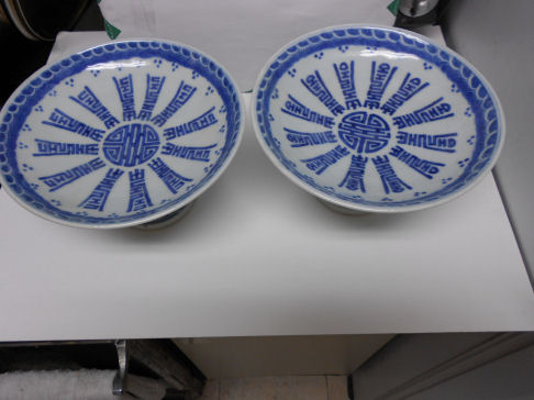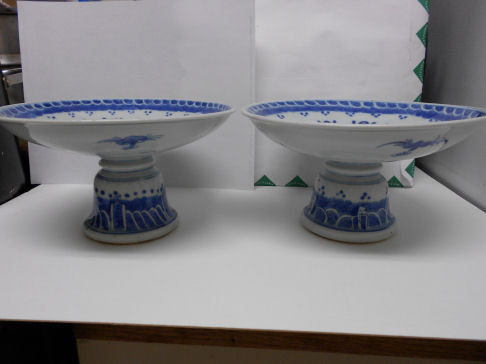 blue and white tazzas with long-life designs 8" D. 4 1/2" H.