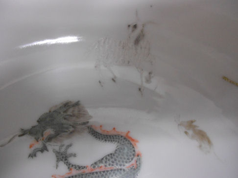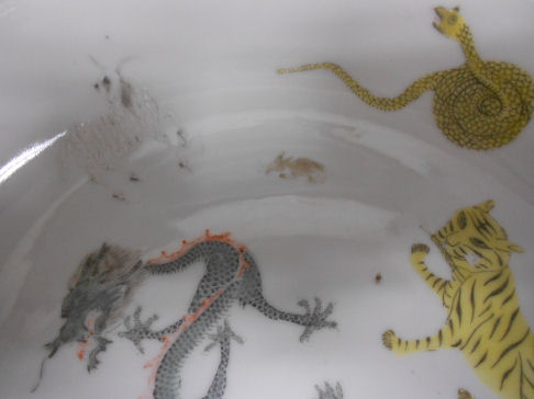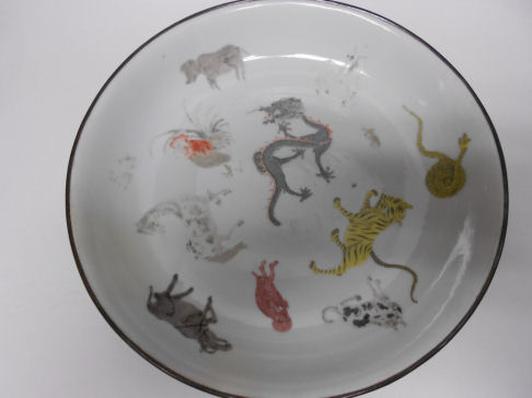 Extremely rare porcelain dish , silver rim , finely enameled with the chinese ZODIAC animals chiaching seal mark . 9 1/2" D.