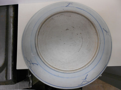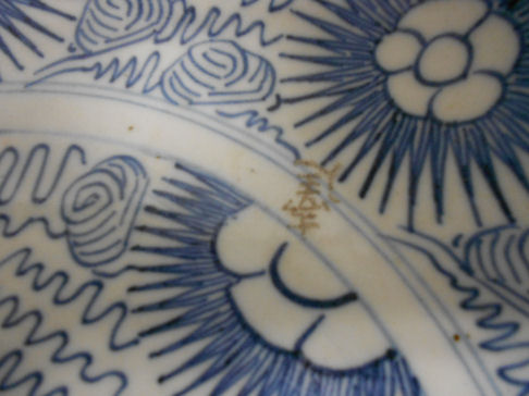 period blue & white porcelain dish 10 1/2" D. has a collector's mark [see image]